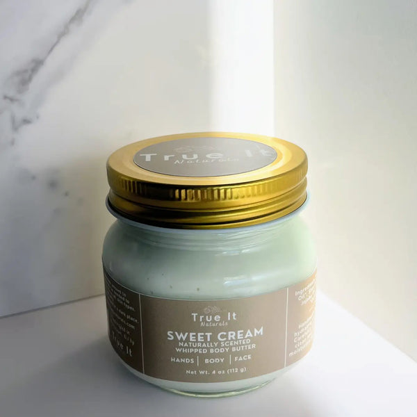 Large True It Naturals Sweet Cream whipped body butter with the lid off showing the cream texture.