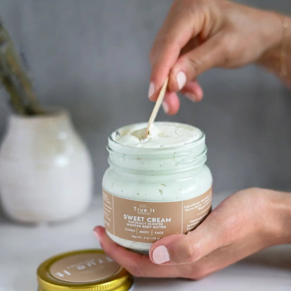 Person using a wooden spoon to scoop out cream from a jar of True It Naturals Sweet Cream whipped body butter.